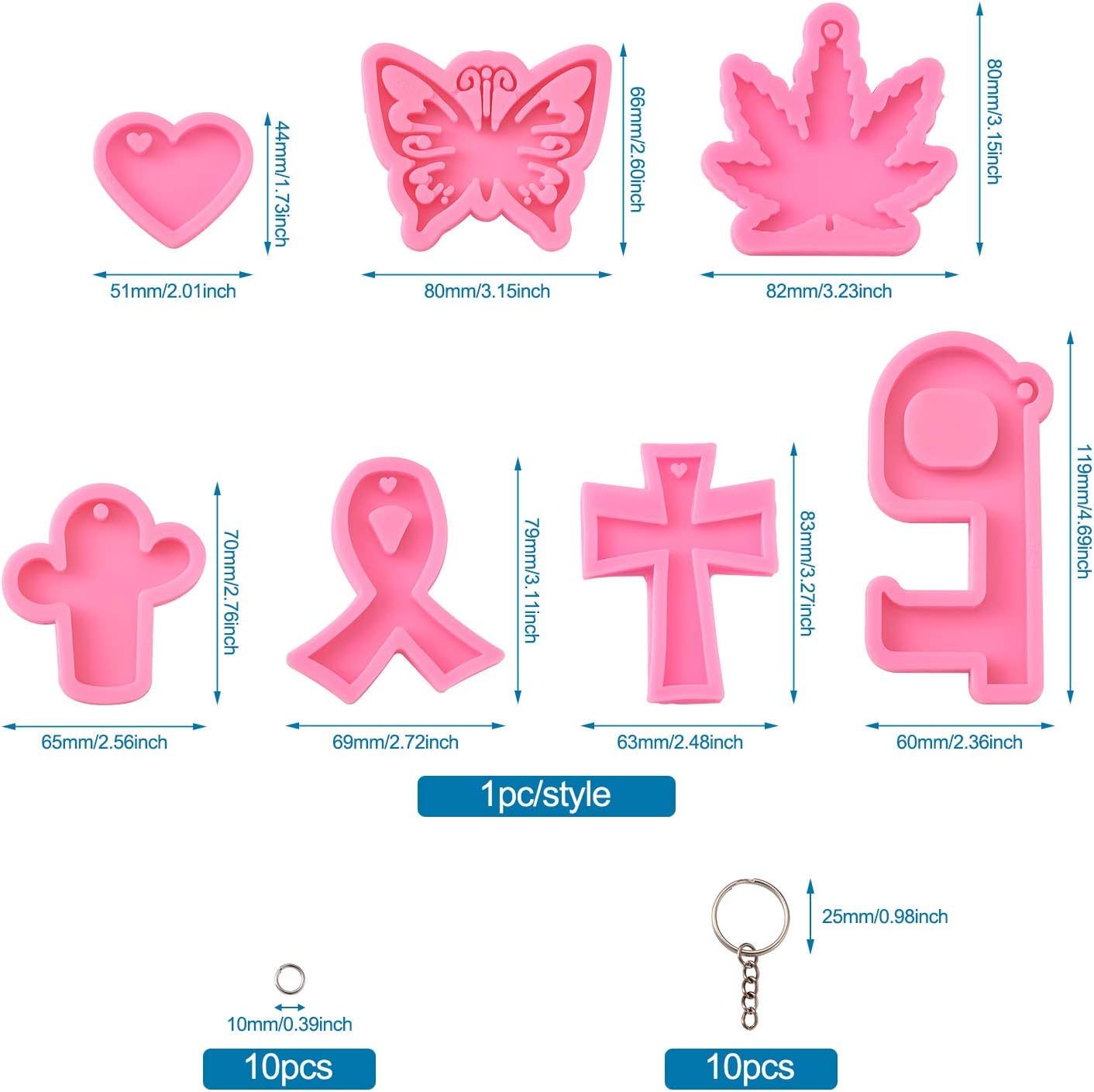 DIY Silicone Keychain Making Molds Kit, PinkDimension: Ribbon Silicone Fondant Molds: 79x69x11mm, 56x70mm inner diameter, 1pcMaple Leaf Silicone Pendant Molds: 80x82x10mm, hole: 5mm; inner size: 68x71mm, 1pcCross Silicone Pendant Molds: 83x63mm, 1pcCactus Silicone Pendant Molds: 70x65x11.5mm, hole: 5mm, 1pcKey Chain Silicone Pendant Molds: 119x60x10mm, 105x45mm inner diameter, pin: 5mm, 1pcButterfly Silicone Pendant Molds: 66x80x11mm, hole: 3mm, 1pcHeart Silicone Pendant Molds: 44x51x9mm, hole: 6x8mm, 1pcBrass Close but Unsoldered Jump Rings: 10mm in diameter, 1mm thick(18 Gauge), about 8mm inner diameter, 10pcsIron Keychain Clasp Findings: 25mm in diameter, 2mm thick, 22mm inner diameter, 10pcs