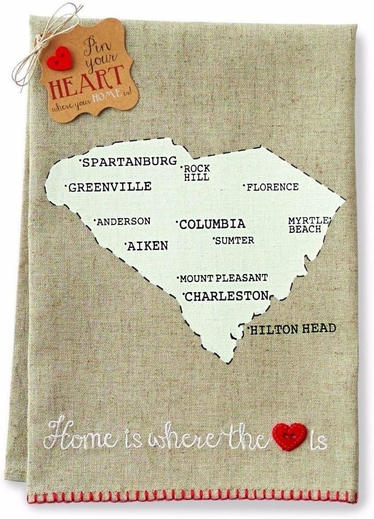 Burlap towel features embroidered "Home is where the is" message and moveable lapel-style heart pin to mark your home state.