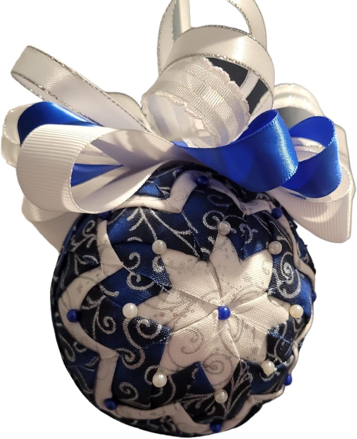 This beautiful Handmade Ornament is done in Navy and White/Ivory Fabric in a Star Burst Style Fold and adorned with beading Made from: 3" Styrofoam Ball and Fabric Pins Trim Ribbon and adorned with Beading