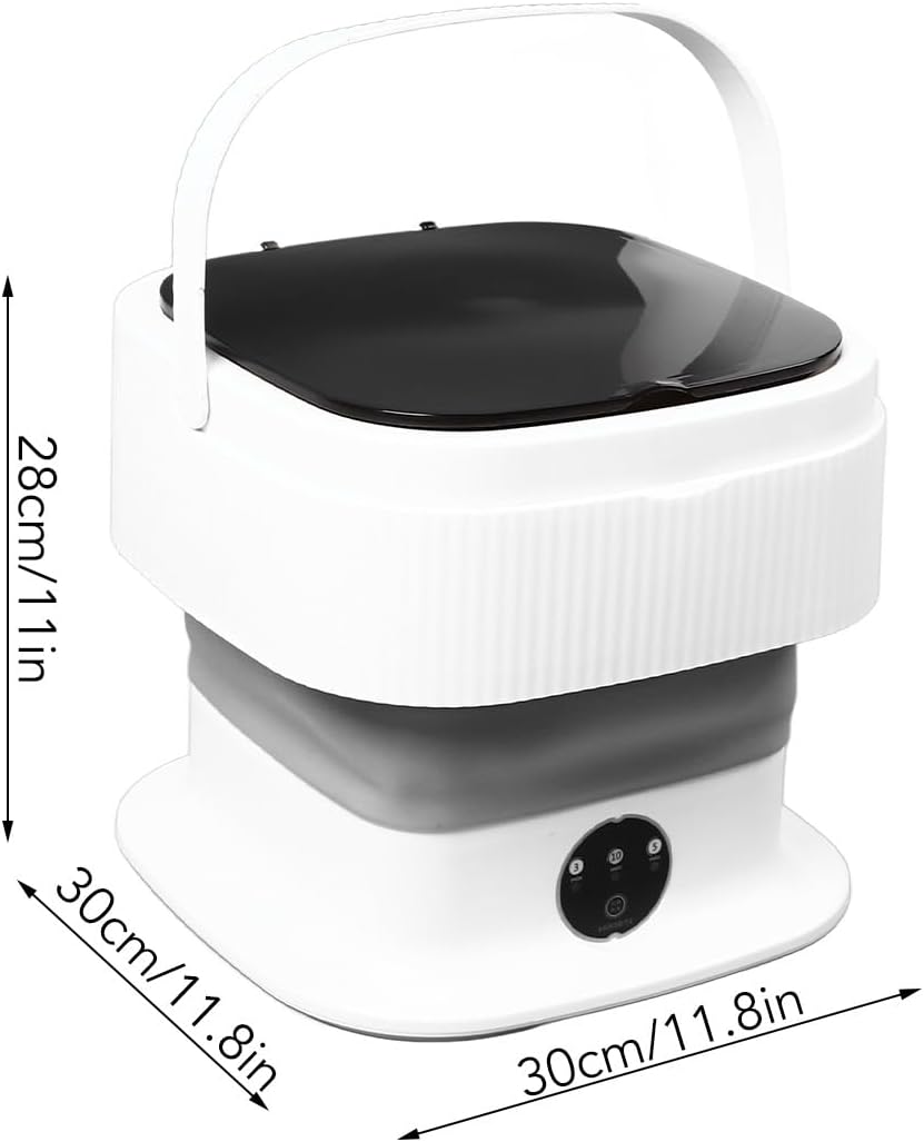 1. Portable and Compact: foldable washing machine comes with a drainage pipe and a collapsible drainage basket, making it easy to carry. It is an ideal choice for apartments, dorms, RVs, travel, or camping.2. Deep : This mini washing machine provides washing speed and achieves powerful removal effects. With blue light, it is for baby clothes, underwear, socks, and other small garments.3. Space Saving Foldable Design: This small portable washer ingeniously adopts a foldable design. It can be easily placed between shelves or under bed, without taking up too much space.4. Adjustable 3 Modes: mini washer has 3 speed adjustment function with three patterns from left to right. pattern lights up to indicate selected mode. Short press bottom button to switch to different modes.5. and Low Power Consumption: Portable washing machine is made of TPE and silicone materials, making it an excellent choice for personal items. It requires only 0.05 kWh of electricity per laundry, making it energy saving.Specification:Item Type: Foldable Washing MachineMaterial: PlasticPlug Type: US Plug 100-240VHow to Use: first pattern indicates a 3 minute semi drying timeThe second pattern indicates a 10 minute standard washing time third pattern indicates a 5 minute gentle washing time PackageList:1 xFoldable Washing Machine1 x Washing Machine Cover2 x Basket1 x Drain Pipe1 x Plug