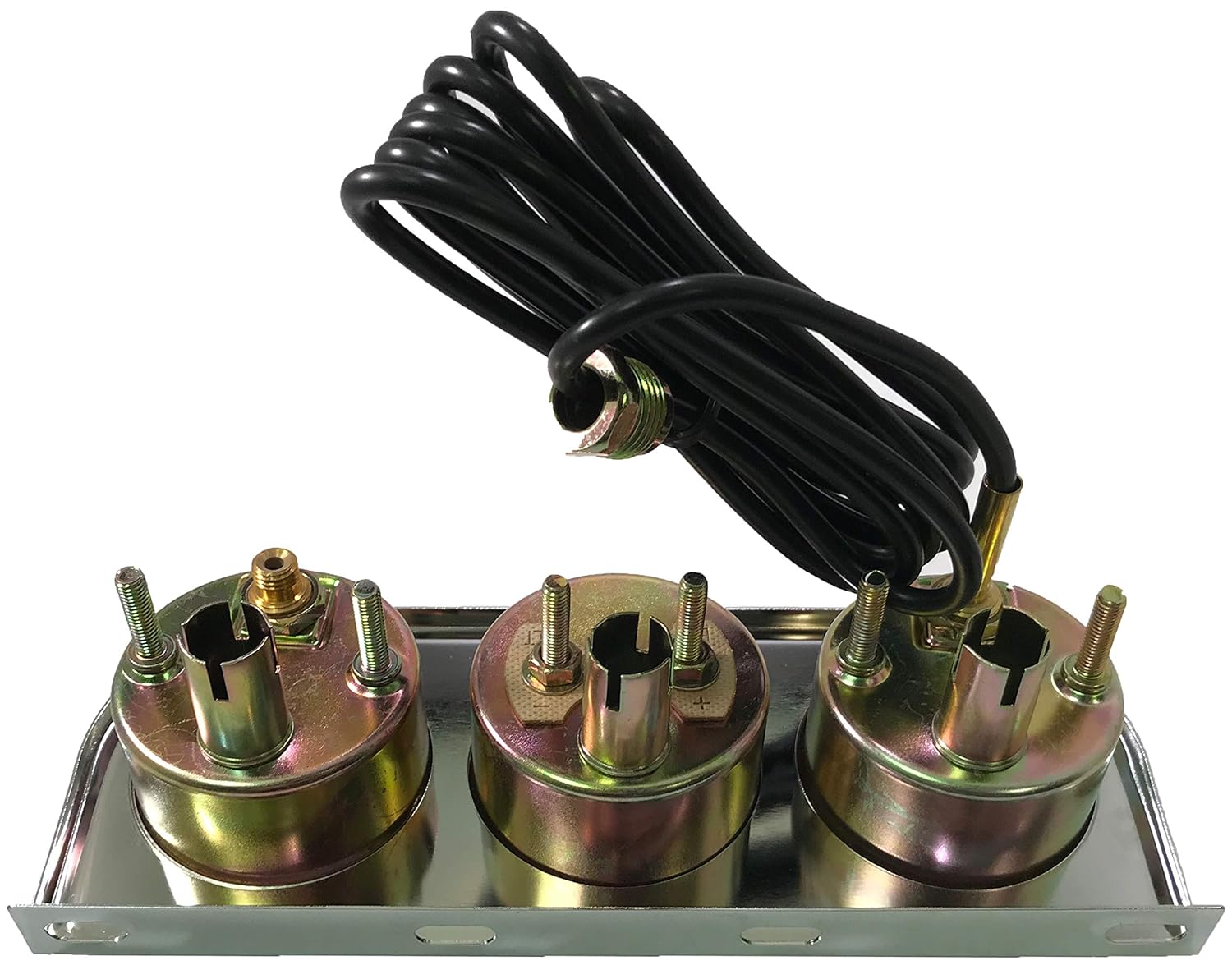 New Chrome Triple Gauge Set w/ Oil Pressure, Ammeter, and Water temperature gauges Includes oil line, adapters, and Light Kit Gauges can be removed from panel for 2" hole Overall panel size Width:7-1/2" Height:2-7/8" Depth: 2-1/4"