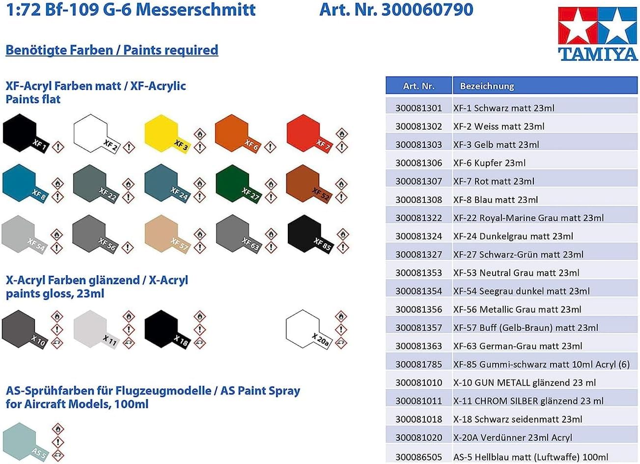 | Included Components | Tamiya 60790 1/72 Messerschmitt BF109 G-6 Plastic Model Airplane Kit |